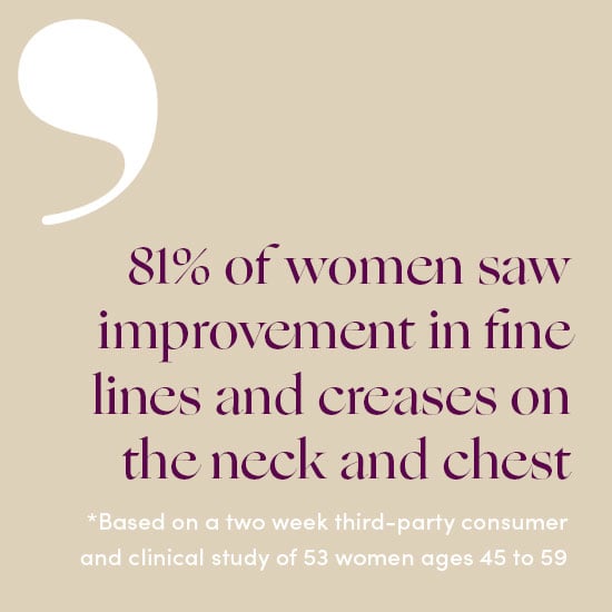 In an industry offering mostly facial treatments for women in midlife, we formulated a solution for the thinner, crepey skin on your neck and chest area, too. Our #1 bestseller delivers the benefits of a specialized serum and a skin-boosting cream, plus it goes on with a medical-grade, stainless-steel roller applicator that cools and massages skin. Thanks to unique plant-based ingredients, you’ll see the appearance of instant tightening and smoothing, plus the appearance of firming, brightening, and less sagging and crepiness in the long term. P.S. It's great for tech neck, too!